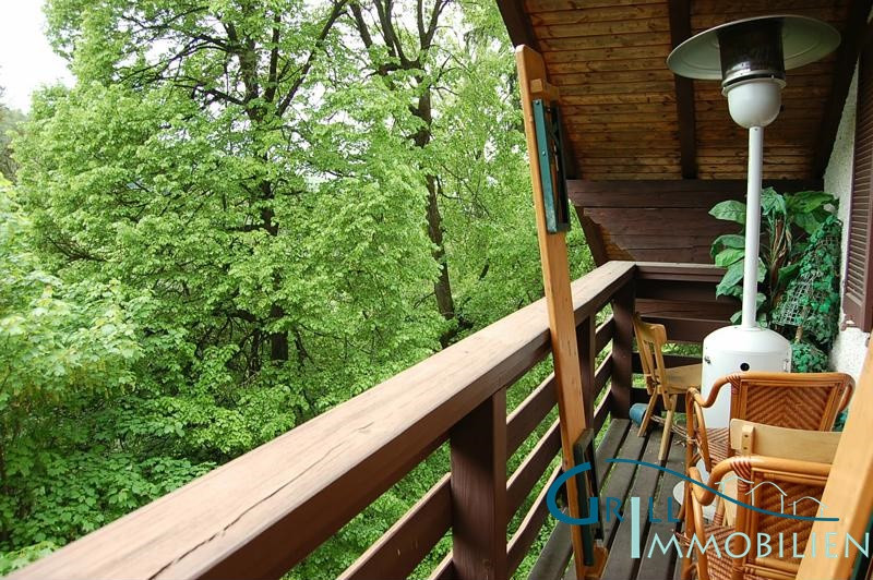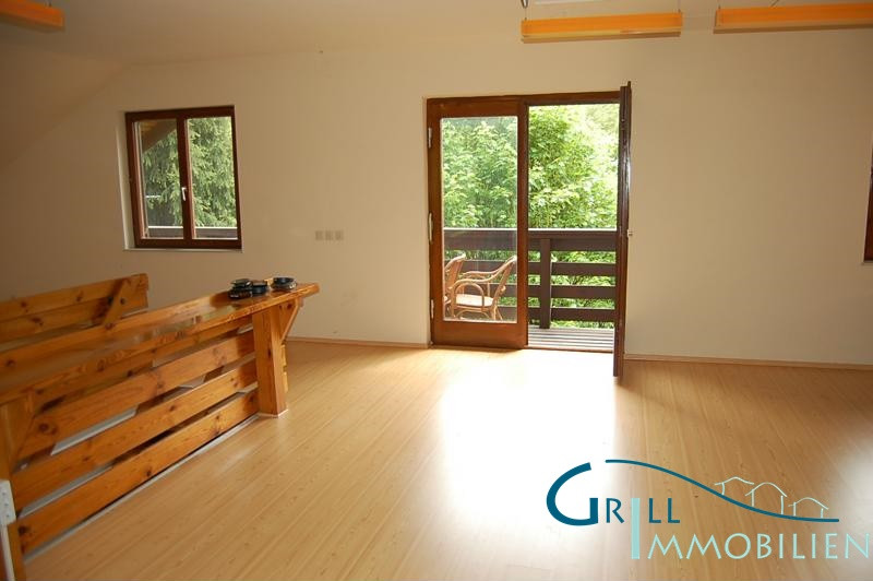 Eine schöne Holzstiege führt ins OBERGESCHOSS: hier finden Sie ein geräumiges, ausgebautes Zimmer mit Laminatboden und großem Balkon vor.